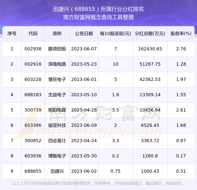 按照南方財富網(wǎng)趨勢選股系統(tǒng)統(tǒng)計,迅捷興所屬行業(yè)為印制電路板行業(yè),印制電路板行業(yè)分紅排名情況如下表: