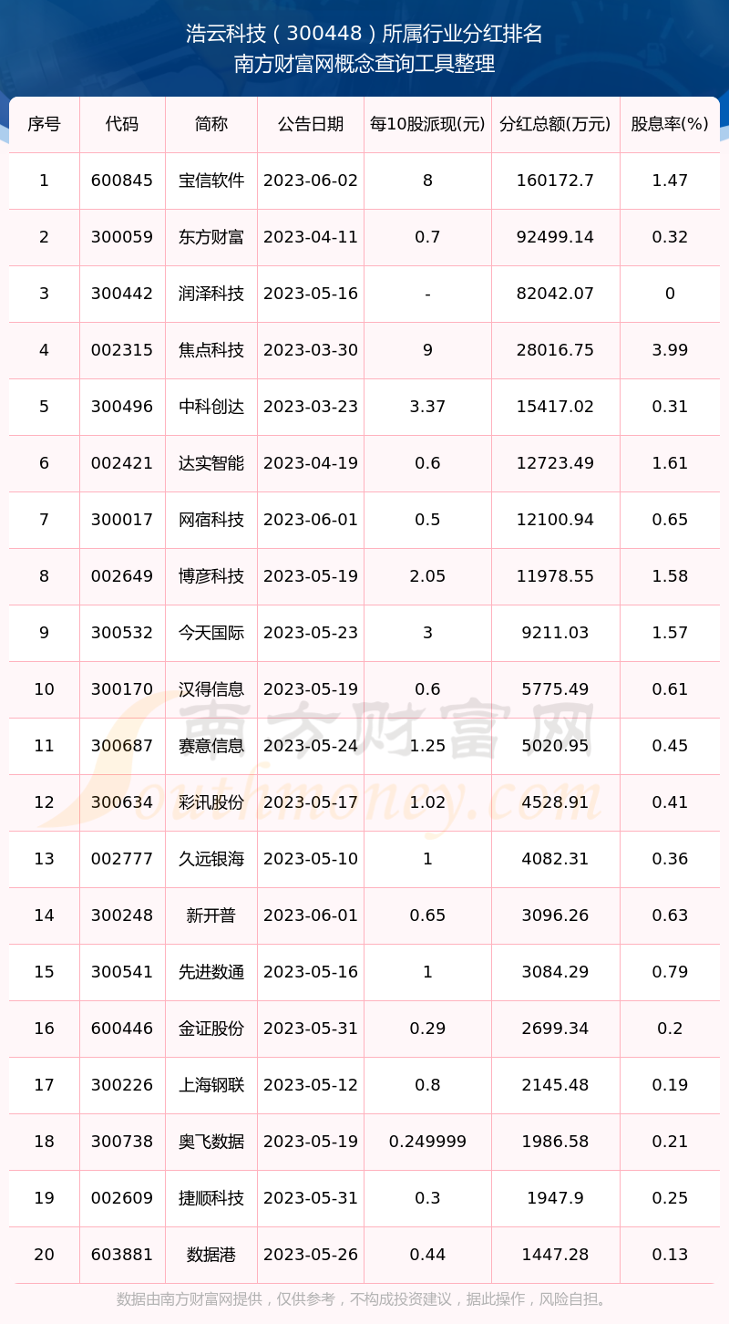 按照南方財富網(wǎng)趨勢選股系統(tǒng)統(tǒng)計,浩云科技所屬行業(yè)為互聯(lián)網(wǎng)服務行業(yè),互聯(lián)網(wǎng)服務行業(yè)分紅排名情況如下表: