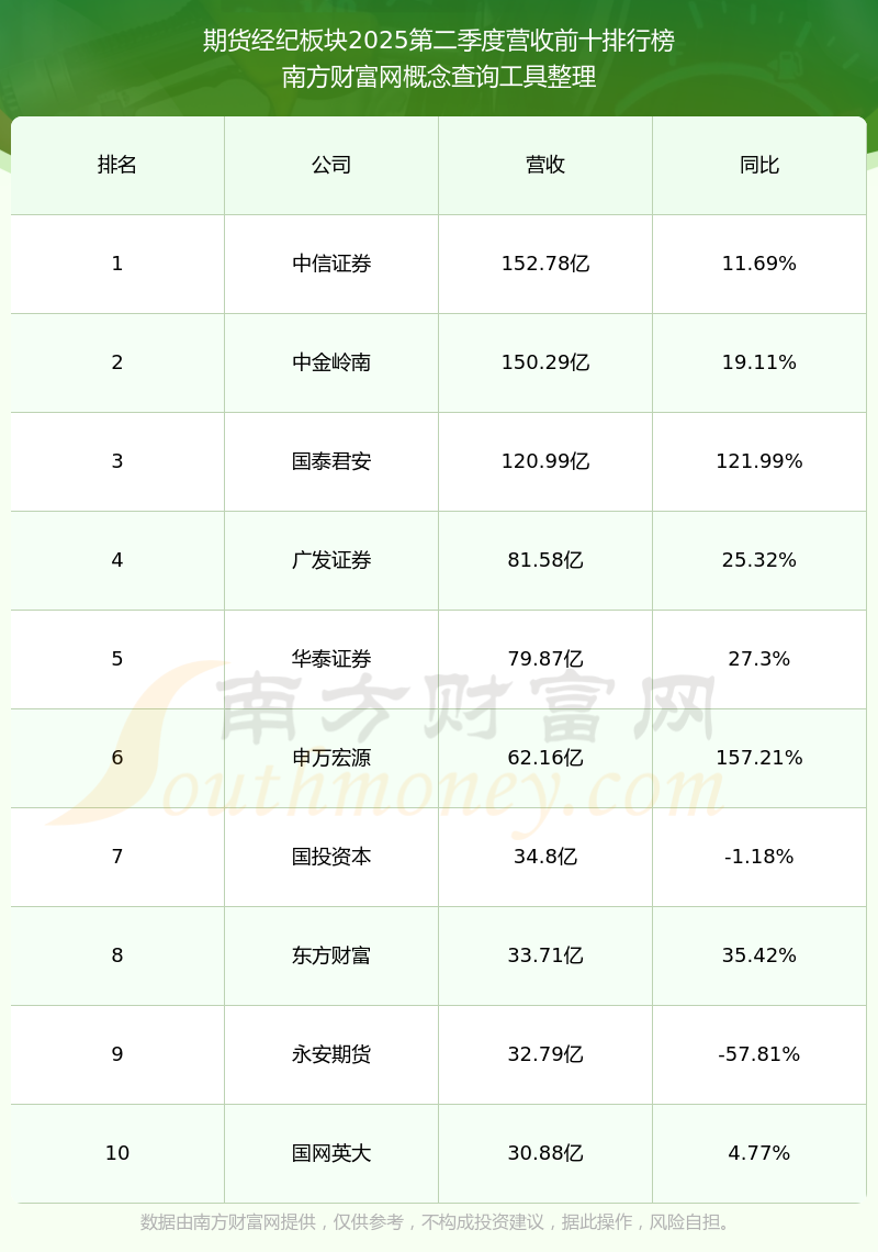 按照南方財(cái)富網(wǎng)概念查詢工具統(tǒng)計(jì),該股所屬板塊為期貨經(jīng)紀(jì)板塊,該板塊共有25只股票,永安期貨2025第二季度營(yíng)收在該板塊中排名為第9名,該板塊2025第二季度營(yíng)收排名前十的股票如下表: