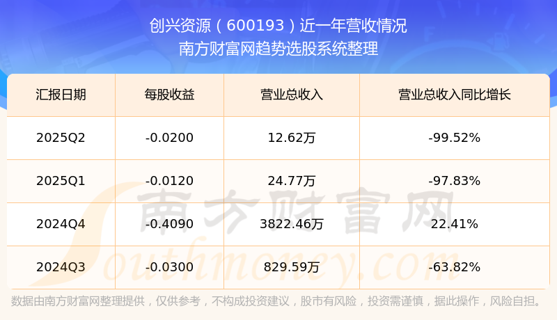 創(chuàng)興資源(600193)披露2025年第二季度報告,報告期實現營收12.62萬元,同比-99.52%;歸母凈利潤-842.03萬元,同比10.59%;扣非凈利潤-865.08萬元,同比11.72%。