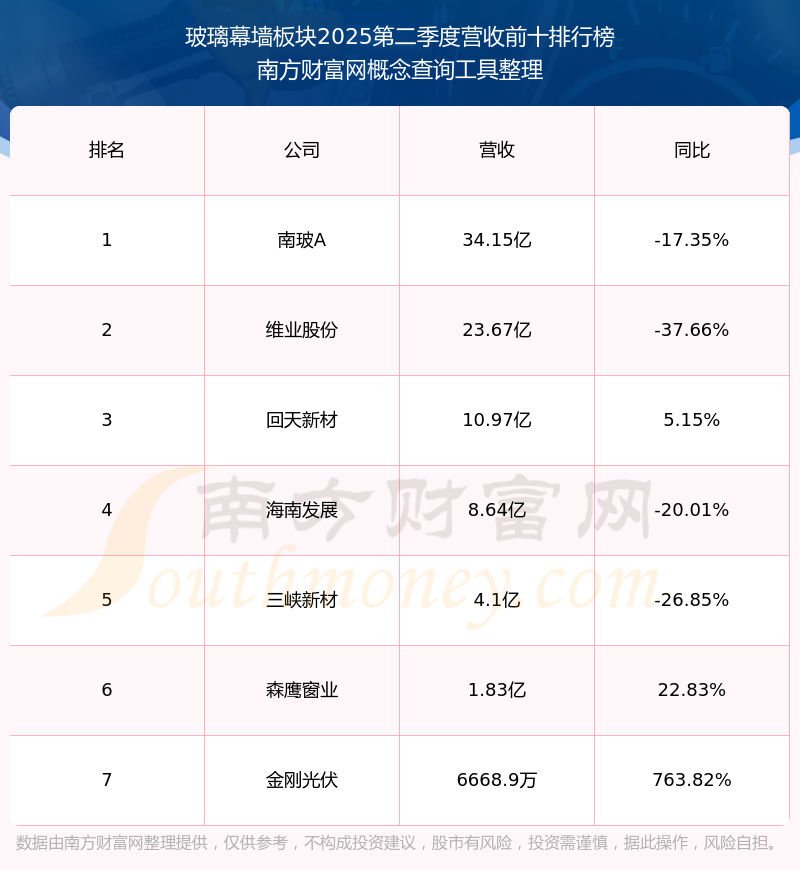 按照南方財富網概念查詢工具統(tǒng)計,該股所屬板塊為玻璃幕墻板塊,該板塊共有7只股票,創(chuàng)興資源2025第二季度營收在該板塊中排名為第7名,該板塊2025第二季度營收排名前十的股票如下表: