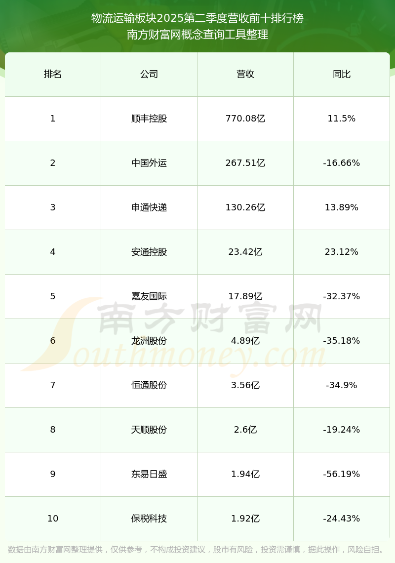 按照南方財(cái)富網(wǎng)概念查詢工具統(tǒng)計(jì),該股所屬板塊為物流運(yùn)輸板塊,該板塊共有11只股票,中谷物流2025第二季度營(yíng)收在該板塊中排名為第11名,該板塊2025第二季度營(yíng)收排名前十的股票如下表: