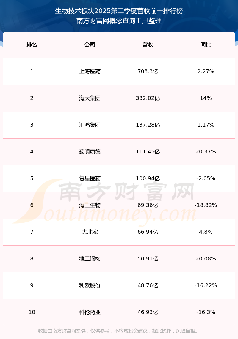 按照南方財(cái)富網(wǎng)概念查詢工具統(tǒng)計(jì),該股所屬板塊為生物技術(shù)板塊,該板塊共有140只股票,潔特生物2025第二季度營(yíng)收在該板塊中排名為第140名,該板塊2025第二季度營(yíng)收排名前十的股票如下表: