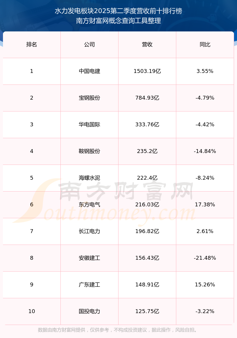 按照南方財富網(wǎng)概念查詢工具統(tǒng)計,該股所屬板塊為水力發(fā)電板塊,該板塊共有44只股票,國電電力2025第二季度營收在該板塊中排名為第44名,該板塊2025第二季度營收排名前十的股票如下表: