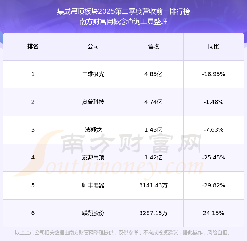按照南方財(cái)富網(wǎng)概念查詢工具統(tǒng)計(jì),該股所屬板塊為集成吊頂板塊,該板塊共有6只股票,奧普科技2025第二季度營收在該板塊中排名為第2名,該板塊2025第二季度營收排名前十的股票如下表: