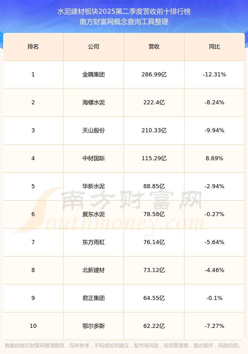 按照南方財(cái)富網(wǎng)概念查詢工具統(tǒng)計(jì),該股所屬板塊為水泥建材板塊,該板塊共有48只股票,韓建河山2025第二季度營(yíng)收在該板塊中排名為第42名,該板塊2025第二季度營(yíng)收排名前十的股票如下表: