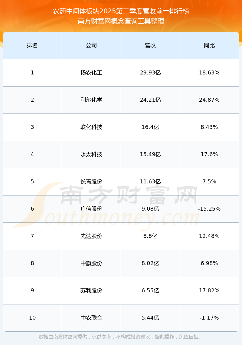 按照南方財富網(wǎng)概念查詢工具統(tǒng)計,該股所屬板塊為農(nóng)藥中間體板塊,該板塊共有21只股票,蘇利股份2025第二季度營收在該板塊中排名為第9名,該板塊2025第二季度營收排名前十的股票如下表:
