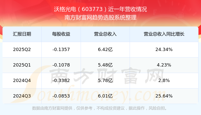 沃格光電2025年第二季度顯示,公司主營收入6.42億元,同比24.34%;歸母凈利潤-3005.8萬元,同比-20.23%;扣非凈利潤-3528.53萬元,同比-1.97%。