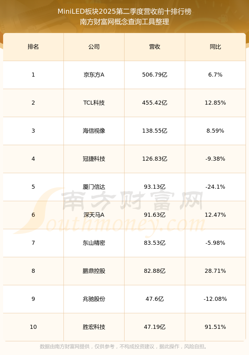 按照南方財富網(wǎng)概念查詢工具統(tǒng)計,該股所屬板塊為MiniLED板塊,該板塊共有77只股票,沃格光電2025第二季度營收在該板塊中排名為第44名,該板塊2025第二季度營收排名前十的股票如下表: