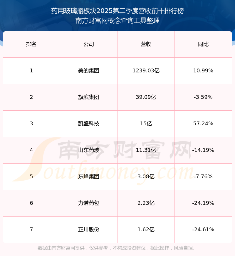按照南方財富網(wǎng)概念查詢工具統(tǒng)計,該股所屬板塊為藥用玻璃瓶板塊,該板塊共有7只股票,正川股份2025第二季度營收在該板塊中排名為第7名,該板塊2025第二季度營收排名前十的股票如下表: