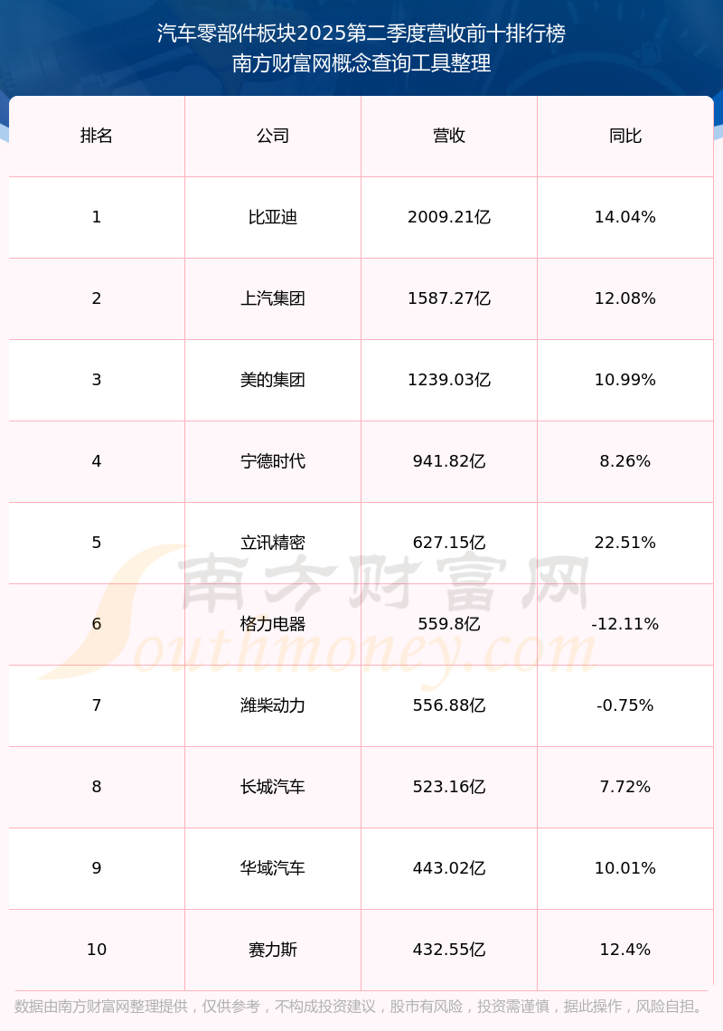 按照南方財(cái)富網(wǎng)概念查詢工具統(tǒng)計(jì),該股所屬板塊為汽車零部件板塊,該板塊共有567只股票,華達(dá)科技2025第二季度營收在該板塊中排名為第122名,該板塊2025第二季度營收排名前十的股票如下表: