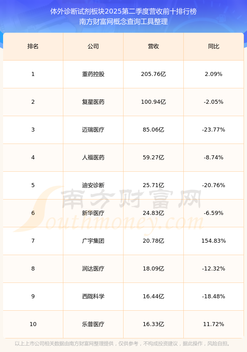 按照南方財(cái)富網(wǎng)概念查詢工具統(tǒng)計(jì),該股所屬板塊為體外診斷試劑板塊,該板塊共有63只股票,奧泰生物2025第二季度營(yíng)收在該板塊中排名為第37名,該板塊2025第二季度營(yíng)收排名前十的股票如下表: