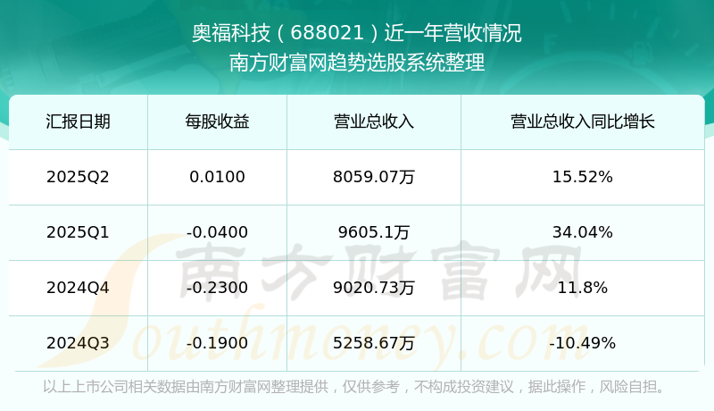 奧福科技2025年第二季度財報顯示,公司主營收入8059.07萬元,同比15.52%;歸母凈利潤85.45萬元,同比117.66%;扣非凈利潤-140.43萬元,同比85.16%。