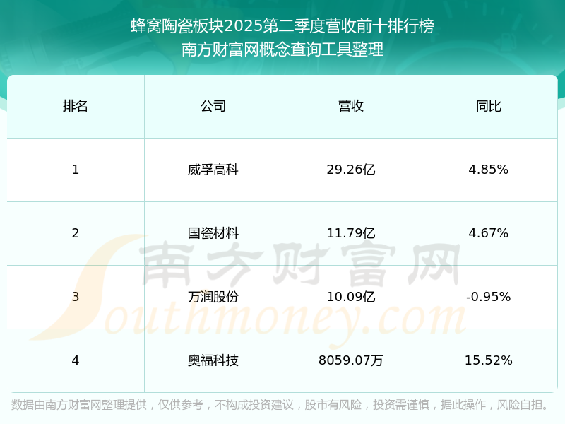 按照南方財富網(wǎng)概念查詢工具統(tǒng)計,該股所屬板塊為蜂窩陶瓷板塊,該板塊共有4只股票,奧福科技2025第二季度營收在該板塊中排名為第4名,該板塊2025第二季度營收排名前十的股票如下表: