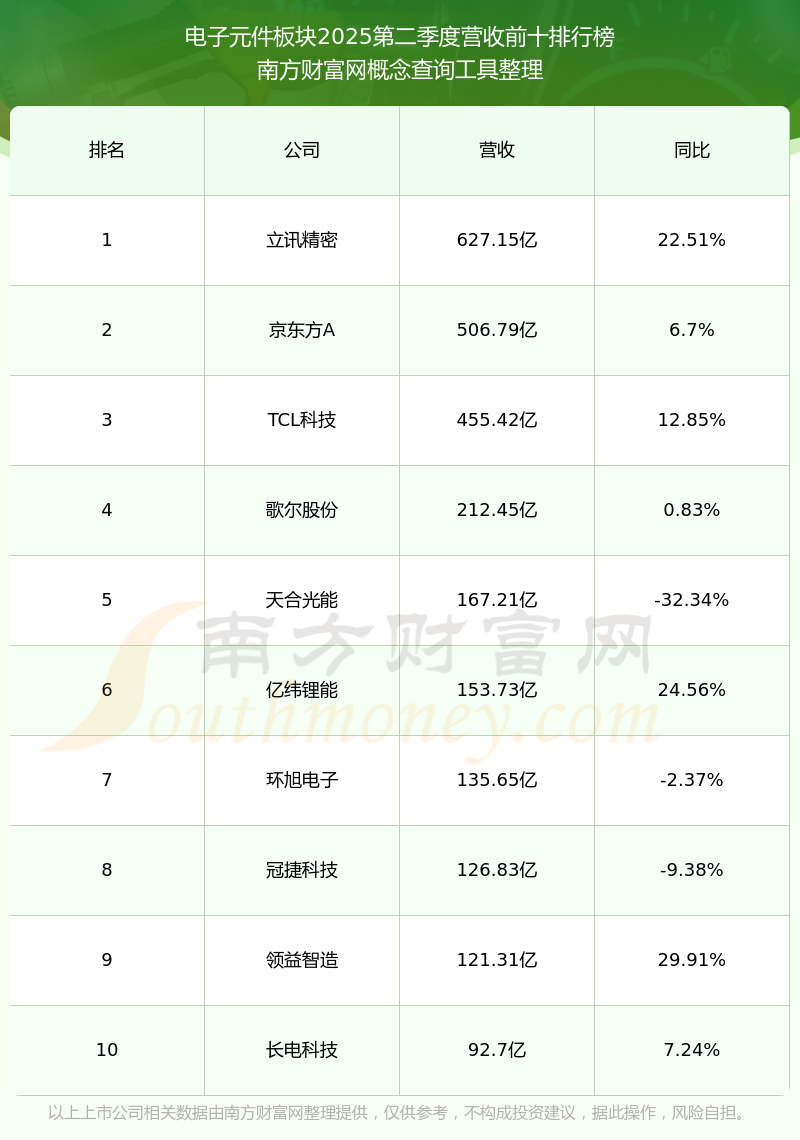 按照南方財富網(wǎng)概念查詢工具統(tǒng)計,該股所屬板塊為電子元件板塊,該板塊共有354只股票,宏昌電子2025第二季度營收在該板塊中排名為第354名,該板塊2025第二季度營收排名前十的股票如下表: