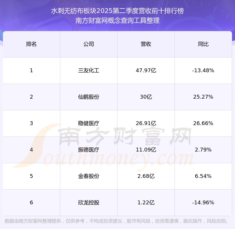 按照南方財(cái)富網(wǎng)概念查詢工具統(tǒng)計(jì),該股所屬板塊為水刺無紡布板塊,該板塊共有6只股票,諾邦股份2025第二季度營(yíng)收在該板塊中排名為第6名,該板塊2025第二季度營(yíng)收排名前十的股票如下表: