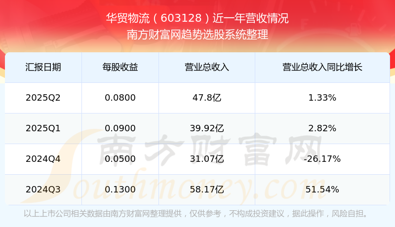 華貿(mào)物流(603128)披露2025年第二季度報(bào)告,報(bào)告期實(shí)現(xiàn)營(yíng)收47.8億元,同比1.33%;歸母凈利潤(rùn)1.1億元,同比-19.31%;扣非凈利潤(rùn)1.09億元,同比-18.76%。