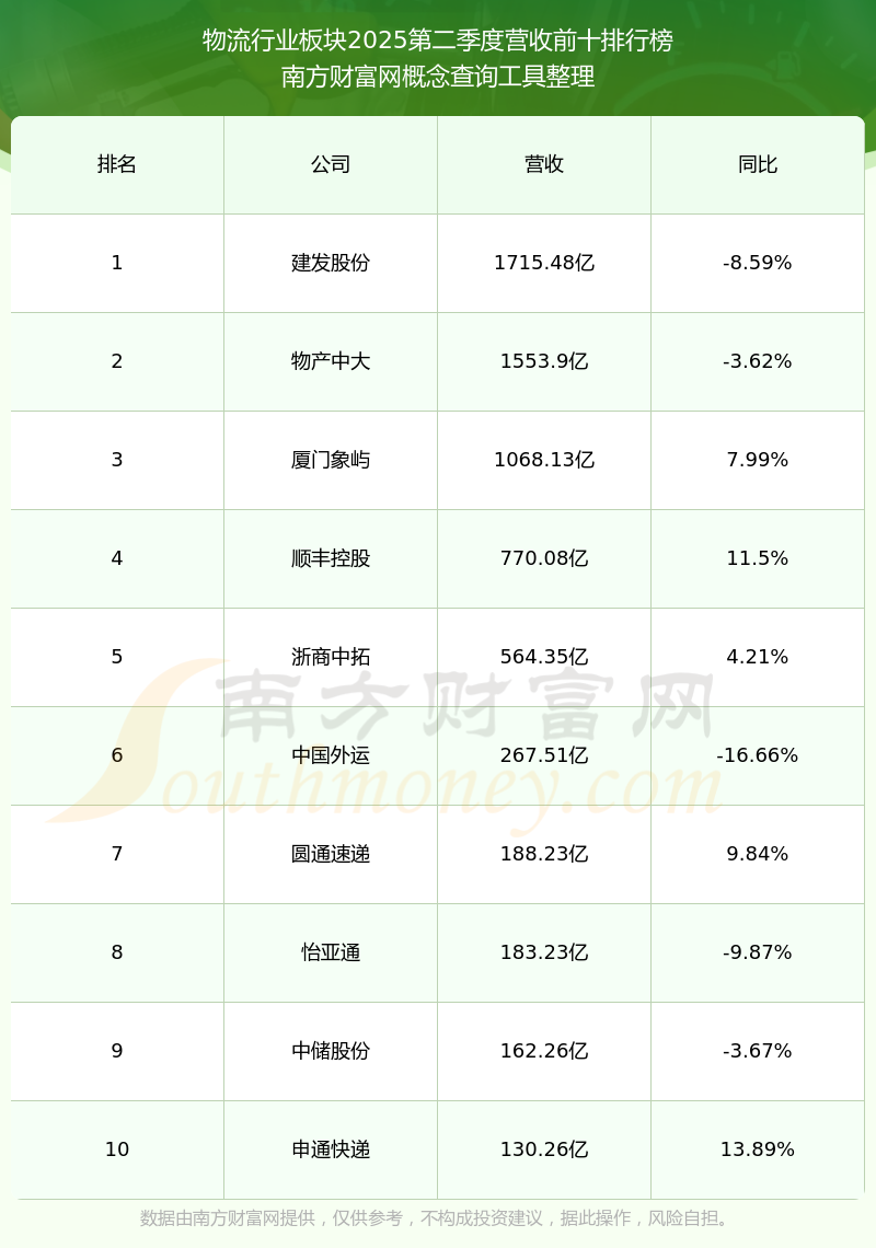 按照南方財(cái)富網(wǎng)概念查詢工具統(tǒng)計(jì),該股所屬板塊為物流行業(yè)板塊,該板塊共有57只股票,華貿(mào)物流2025第二季度營(yíng)收在該板塊中排名為第17名,該板塊2025第二季度營(yíng)收排名前十的股票如下表: