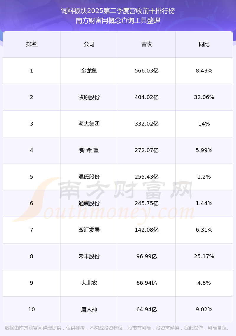 按照南方財(cái)富網(wǎng)概念查詢(xún)工具統(tǒng)計(jì),該股所屬板塊為飼料板塊,該板塊共有66只股票,禾豐股份2025第二季度營(yíng)收在該板塊中排名為第8名,該板塊2025第二季度營(yíng)收排名前十的股票如下表: