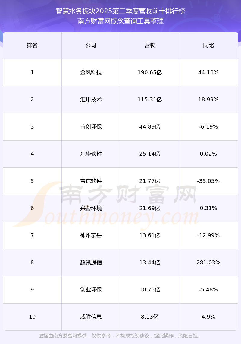 按照南方財(cái)富網(wǎng)概念查詢工具統(tǒng)計(jì),該股所屬板塊為智慧水務(wù)板塊,該板塊共有38只股票,威派格2025第二季度營(yíng)收在該板塊中排名為第27名,該板塊2025第二季度營(yíng)收排名前十的股票如下表: