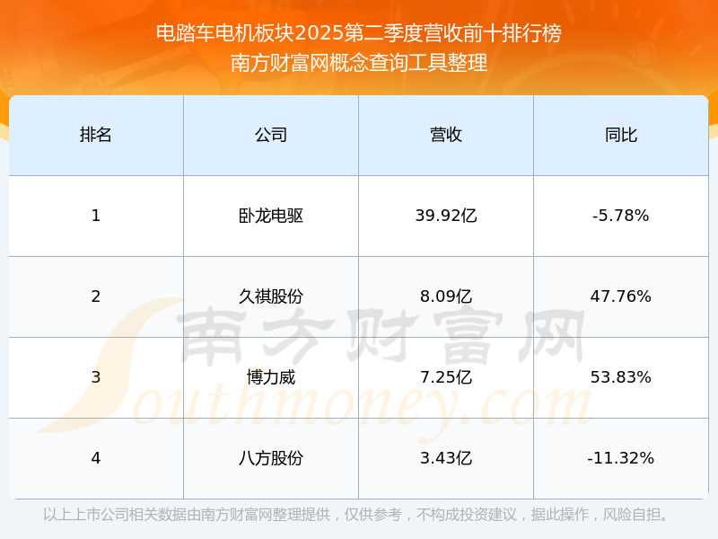 按照南方財(cái)富網(wǎng)概念查詢工具統(tǒng)計(jì),該股所屬板塊為電踏車電機(jī)板塊,該板塊共有4只股票,八方股份2025第二季度營(yíng)收在該板塊中排名為第4名,該板塊2025第二季度營(yíng)收排名前十的股票如下表: