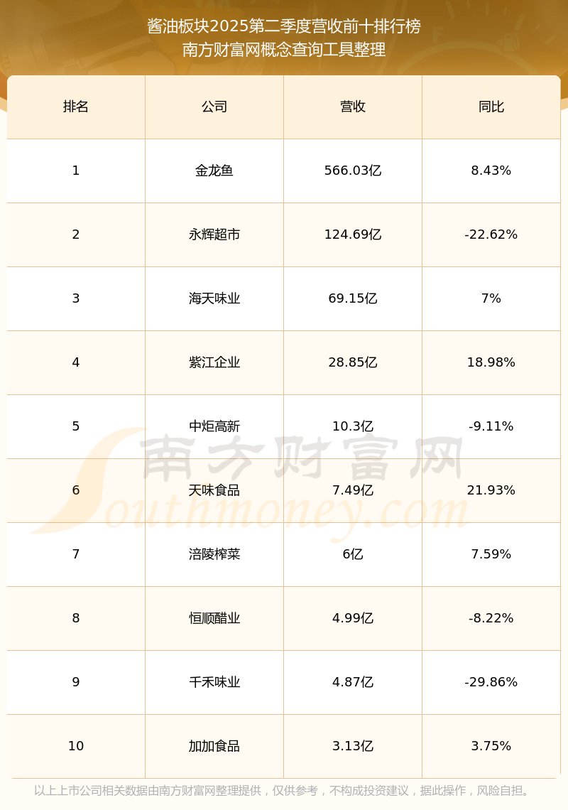 按照南方財富網(wǎng)概念查詢工具統(tǒng)計,該股所屬板塊為醬油板塊,該板塊共有11只股票,千禾味業(yè)2025第二季度營收在該板塊中排名為第9名,該板塊2025第二季度營收排名前十的股票如下表: