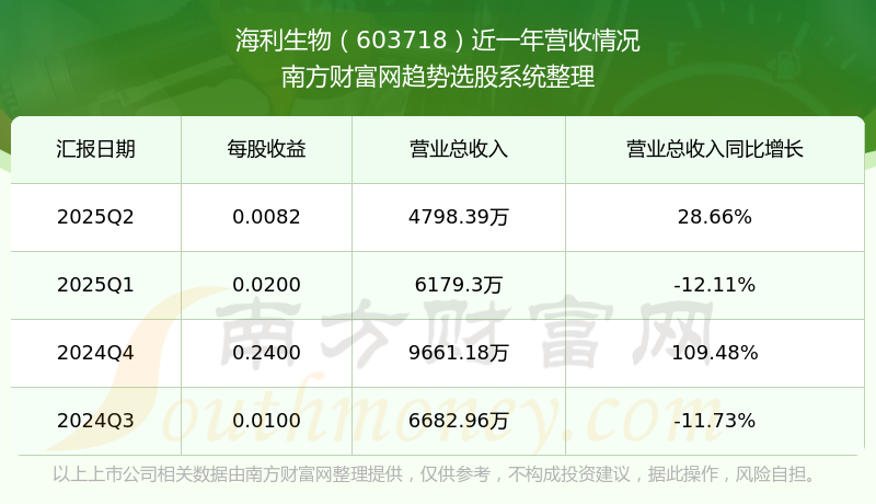海利生物2025年第二季度顯示,公司主營(yíng)收入4798.39萬(wàn)元,同比28.66%;歸母凈利潤(rùn)733.31萬(wàn)元,同比-61.09%;扣非凈利潤(rùn)627.03萬(wàn)元,同比181.02%。