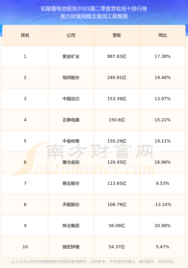 按照南方財(cái)富網(wǎng)概念查詢工具統(tǒng)計(jì),該股所屬板塊為鉛酸蓄電池板塊,該板塊共有24只股票,萬里股份2025第二季度營收在該板塊中排名為第23名,該板塊2025第二季度營收排名前十的股票如下表: