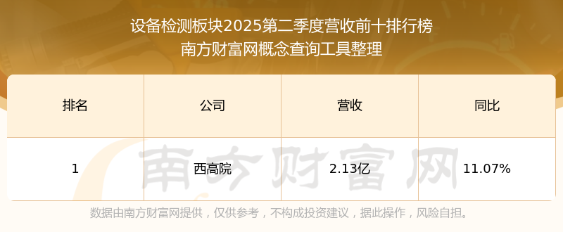 按照南方財(cái)富網(wǎng)概念查詢工具統(tǒng)計(jì),該股所屬板塊為設(shè)備檢測(cè)板塊,該板塊共有1只股票,西高院2025第二季度營(yíng)收在該板塊中排名為第1名,該板塊2025第二季度營(yíng)收排名前十的股票如下表: