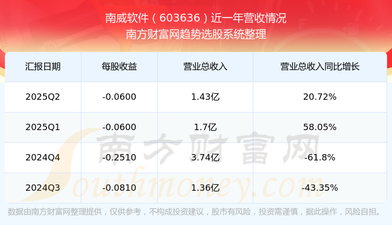 南威軟件2025年第二季度公司實(shí)現(xiàn)營(yíng)業(yè)收入1.43億元,同比20.72%;歸母凈利潤(rùn)-3735.36萬元,同比21.01%。