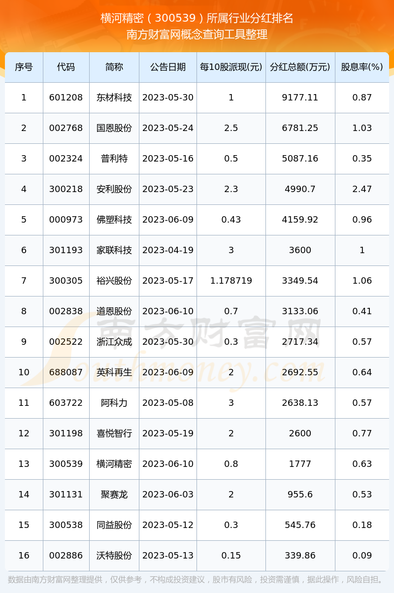 按照南方財富網(wǎng)趨勢選股系統(tǒng)統(tǒng)計,橫河精密所屬行業(yè)為塑料制品行業(yè),塑料制品行業(yè)分紅排名情況如下表:
