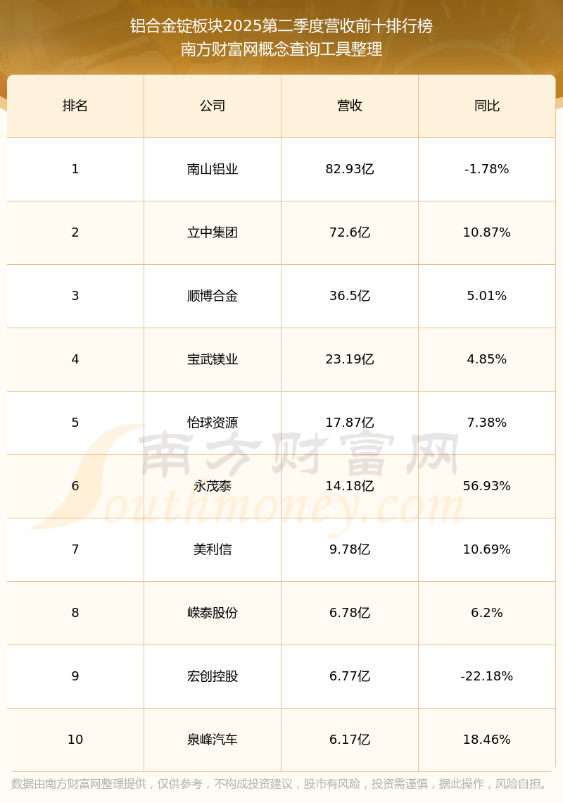 按照南方財(cái)富網(wǎng)概念查詢工具統(tǒng)計(jì),該股所屬板塊為鋁合金錠板塊,該板塊共有14只股票,永茂泰2025第二季度營(yíng)收在該板塊中排名為第6名,該板塊2025第二季度營(yíng)收排名前十的股票如下表: