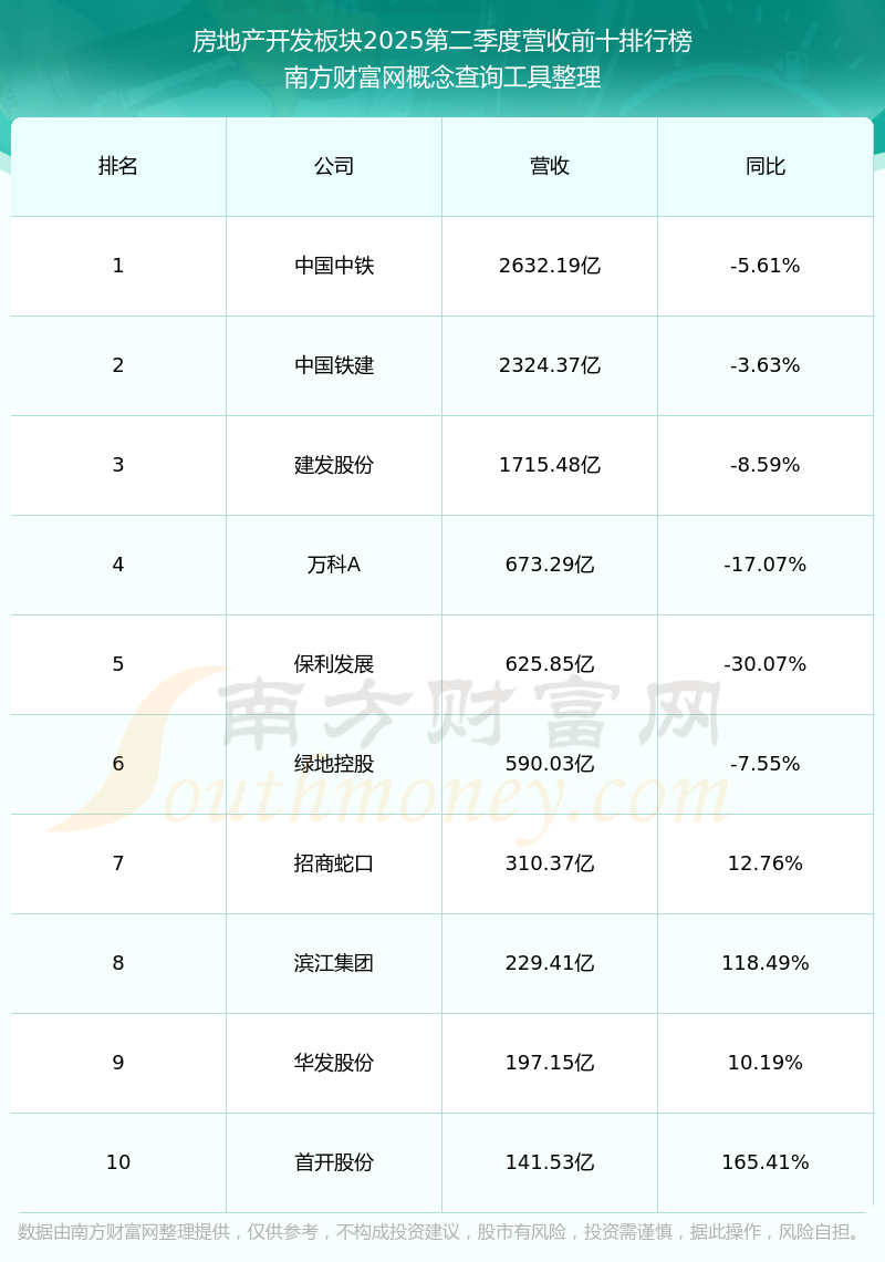 按照南方財(cái)富網(wǎng)概念查詢工具統(tǒng)計(jì),該股所屬板塊為房地產(chǎn)開發(fā)板塊,該板塊共有143只股票,華發(fā)股份2025第二季度營(yíng)收在該板塊中排名為第9名,該板塊2025第二季度營(yíng)收排名前十的股票如下表: