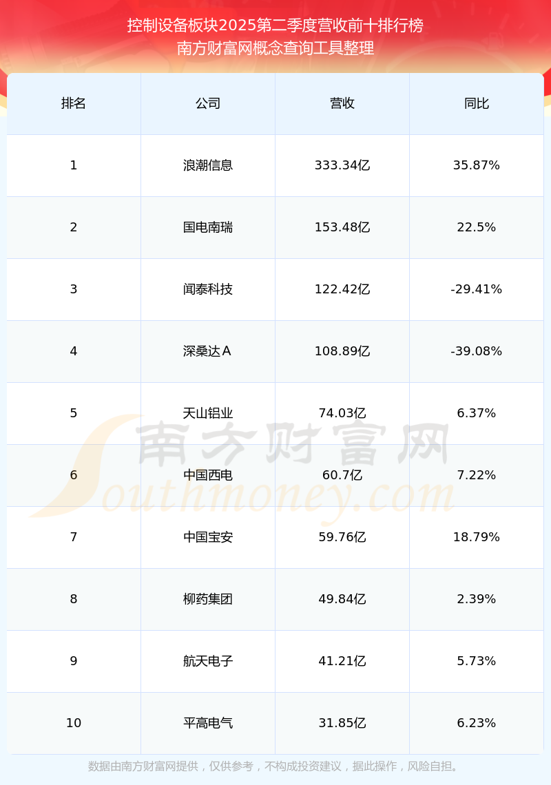 按照南方財(cái)富網(wǎng)概念查詢工具統(tǒng)計(jì),該股所屬板塊為控制設(shè)備板塊,該板塊共有66只股票,興圖新科2025第二季度營(yíng)收在該板塊中排名為第66名,該板塊2025第二季度營(yíng)收排名前十的股票如下表: