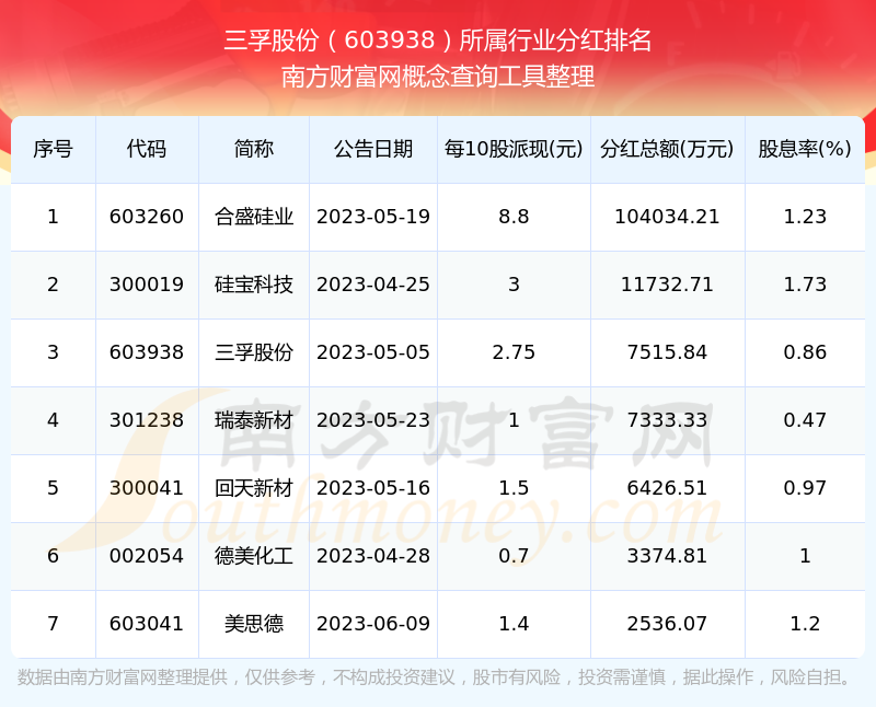 按照南方財富網(wǎng)趨勢選股系統(tǒng)統(tǒng)計,三孚股份所屬行業(yè)為有機硅行業(yè),有機硅行業(yè)分紅排名情況如下表: