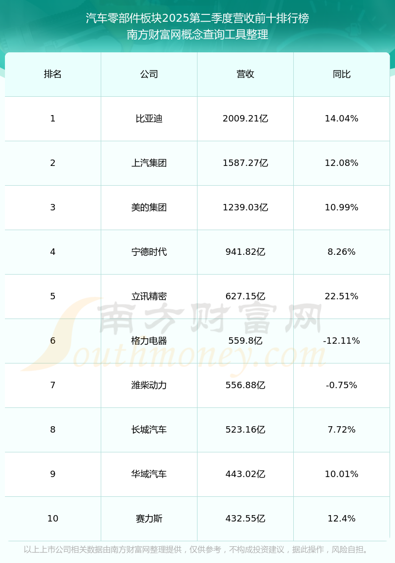 按照南方財富網(wǎng)概念查詢工具統(tǒng)計,該股所屬板塊為汽車零部件板塊,該板塊共有567只股票,友升股份2025第二季度營收在該板塊中排名為第175名,該板塊2025第二季度營收排名前十的股票如下表: