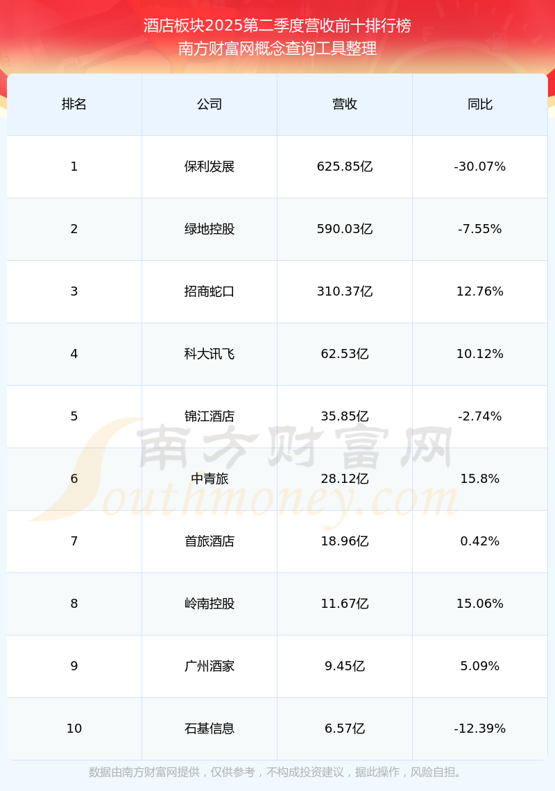 按照南方財(cái)富網(wǎng)概念查詢工具統(tǒng)計(jì),該股所屬板塊為酒店板塊,該板塊共有28只股票,首旅酒店2025第二季度營(yíng)收在該板塊中排名為第7名,該板塊2025第二季度營(yíng)收排名前十的股票如下表: