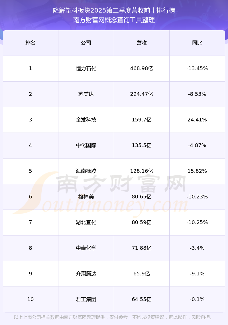 按照南方財富網(wǎng)概念查詢工具統(tǒng)計,該股所屬板塊為降解塑料板塊,該板塊共有64只股票,海正生材2025第二季度營收在該板塊中排名為第56名,該板塊2025第二季度營收排名前十的股票如下表: