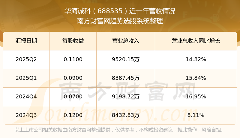 于2025年第二季度,華海誠科披露了其業(yè)績表現(xiàn),其中主營業(yè)務(wù)收入9520.15萬元,相較于去年同期14.82%。此外,公司歸屬于母公司的凈利潤為656.58萬元,同比增長了-45.84%。在扣除所有非經(jīng)常性損益后,凈利潤613.93萬元,同比增長-43.72%。