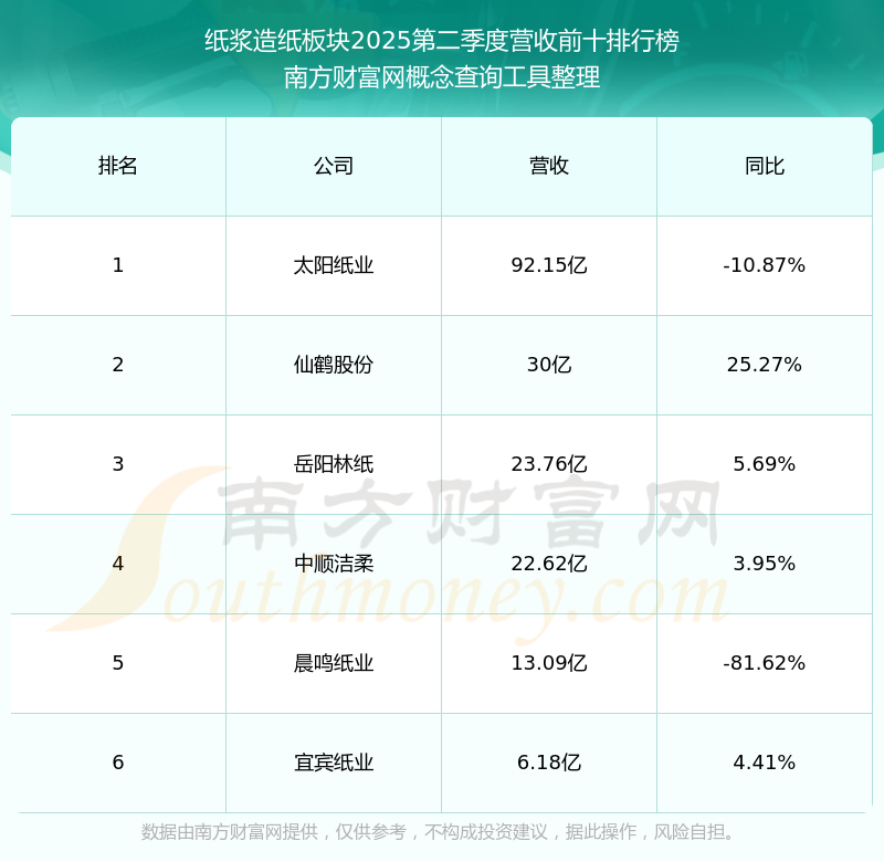 按照南方財(cái)富網(wǎng)概念查詢工具統(tǒng)計(jì),該股所屬板塊為紙漿造紙板塊,該板塊共有6只股票,宜賓紙業(yè)2025第二季度營收在該板塊中排名為第6名,該板塊2025第二季度營收排名前十的股票如下表: