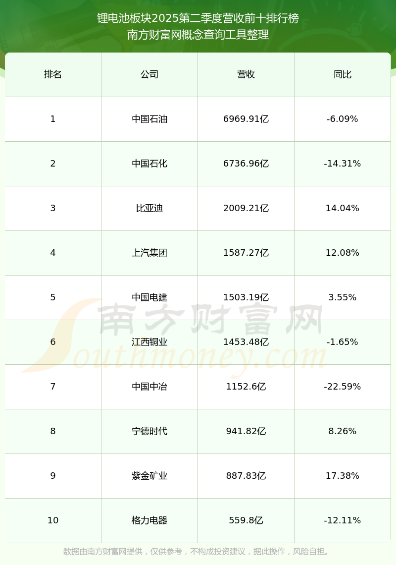按照南方財富網(wǎng)概念查詢工具統(tǒng)計(jì),該股所屬板塊為鋰電池板塊,該板塊共有647只股票,白銀有色2025第二季度營收在該板塊中排名為第20名,該板塊2025第二季度營收排名前十的股票如下表: