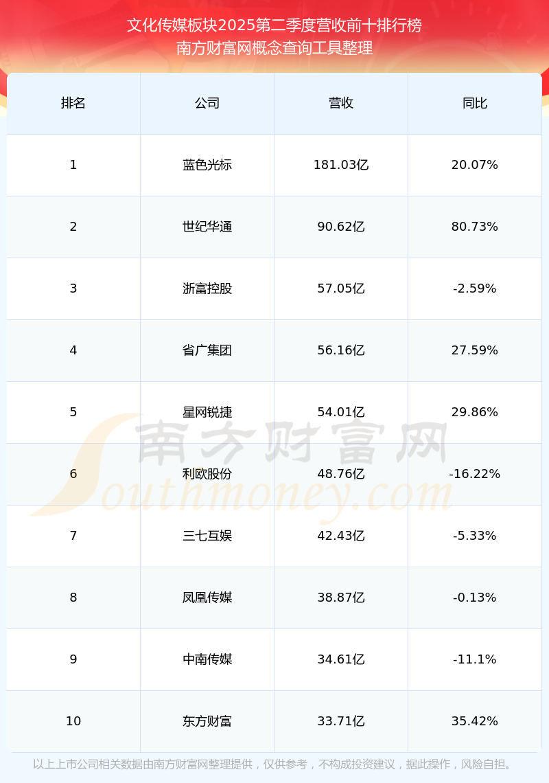 按照南方財(cái)富網(wǎng)概念查詢工具統(tǒng)計(jì),該股所屬板塊為文化傳媒板塊,該板塊共有240只股票,浙版?zhèn)髅?025第二季度營(yíng)收在該板塊中排名為第18名,該板塊2025第二季度營(yíng)收排名前十的股票如下表: