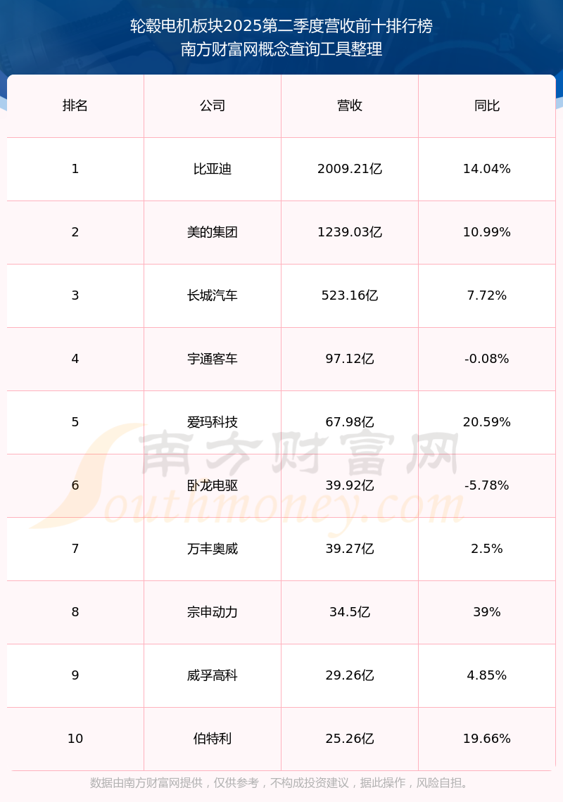 按照南方財(cái)富網(wǎng)概念查詢工具統(tǒng)計(jì),該股所屬板塊為輪轂電機(jī)板塊,該板塊共有39只股票,泉峰汽車2025第二季度營(yíng)收在該板塊中排名為第27名,該板塊2025第二季度營(yíng)收排名前十的股票如下表: