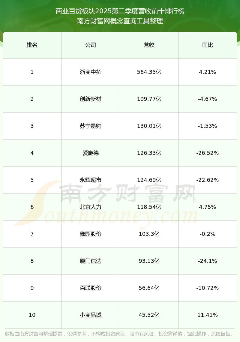按照南方財富網(wǎng)概念查詢工具統(tǒng)計,該股所屬板塊為商業(yè)百貨板塊,該板塊共有75只股票,東百集團2025第二季度營收在該板塊中排名為第46名,該板塊2025第二季度營收排名前十的股票如下表: