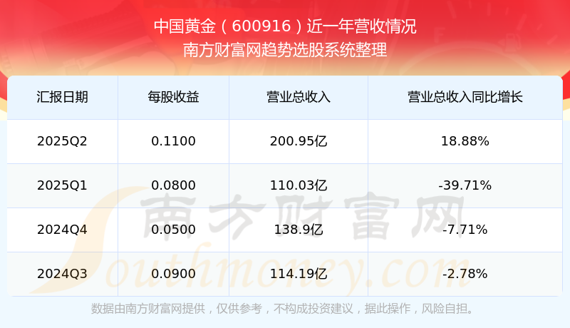 中國(guó)黃金(600916)發(fā)布2025年第二季度財(cái)報(bào)。2025年第二季度中國(guó)黃金實(shí)現(xiàn)營(yíng)業(yè)收入200.95億元,同比增加18.88元%,環(huán)比增加82.64%;凈利潤(rùn)為1.84億元,同比增長(zhǎng)-20.21%,環(huán)比增長(zhǎng)36.92%。