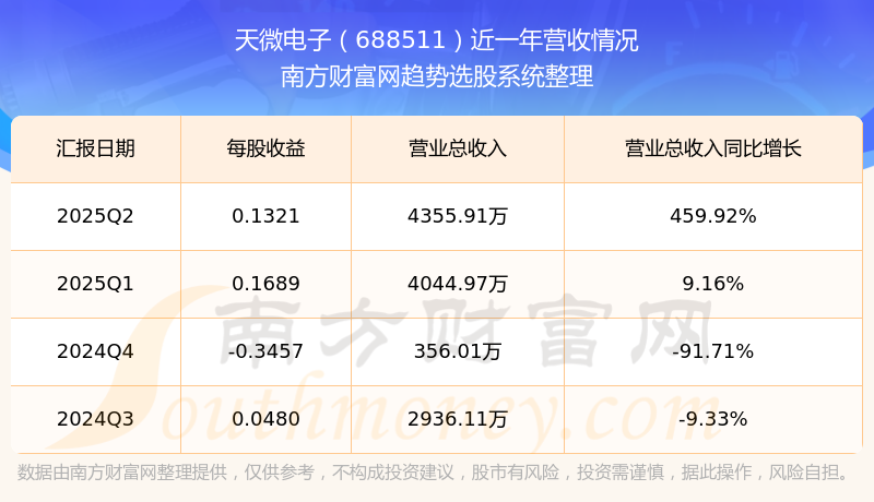 天微電子2025年第二季度顯示,公司主營收入4355.91萬元,同比459.92%;歸母凈利潤1348.14萬元,同比264.77%;扣非凈利潤799.87萬元,同比174.63%。