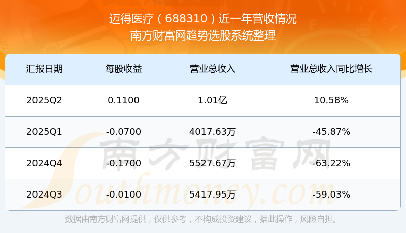邁得醫(yī)療2025年第二季度財(cái)報(bào)顯示,公司主營(yíng)收入1.01億元,同比10.58%;歸母凈利潤(rùn)1684.24萬(wàn)元,同比2759.64%;扣非凈利潤(rùn)1187.67萬(wàn)元,同比923.08%;