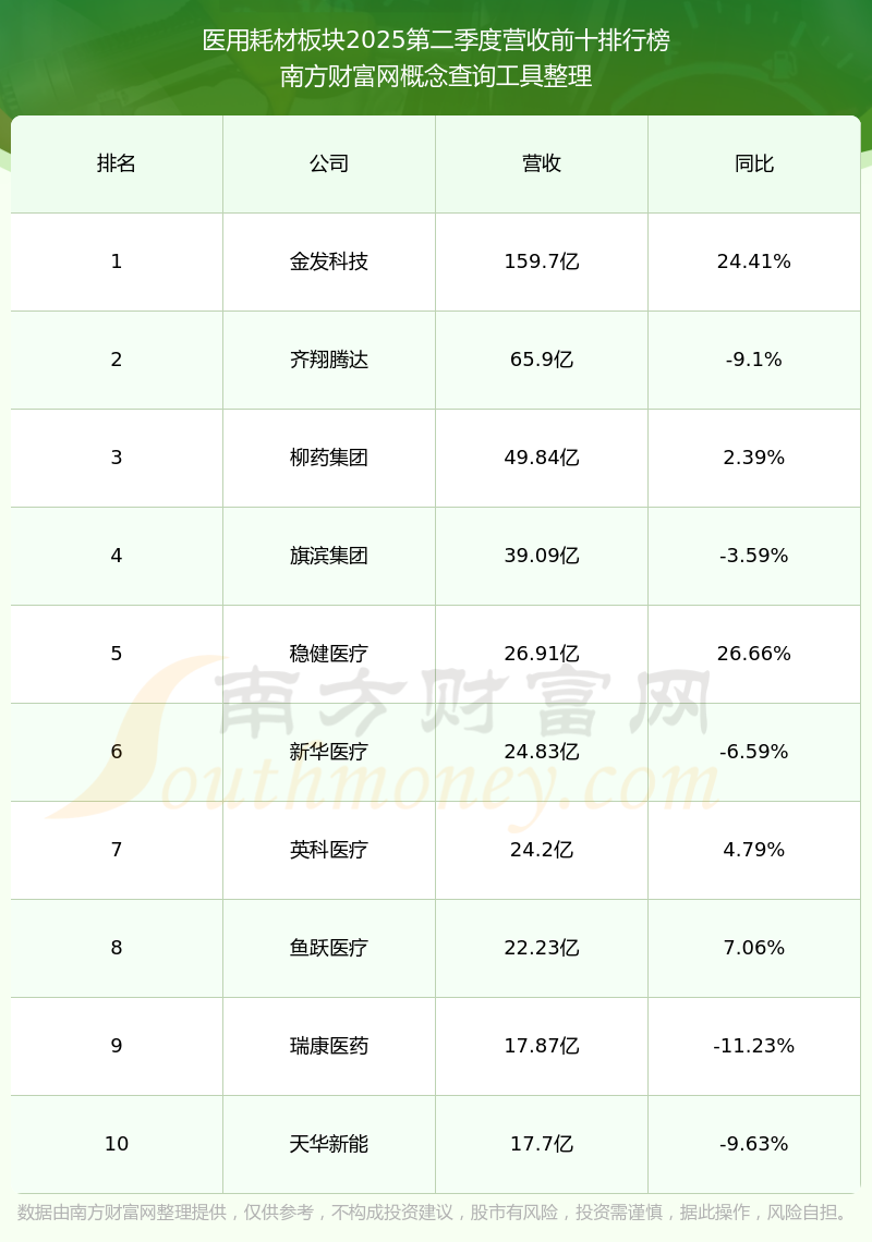 按照南方財(cái)富網(wǎng)概念查詢工具統(tǒng)計(jì),該股所屬板塊為醫(yī)用耗材板塊,該板塊共有99只股票,邁得醫(yī)療2025第二季度營(yíng)收在該板塊中排名為第86名,該板塊2025第二季度營(yíng)收排名前十的股票如下表: