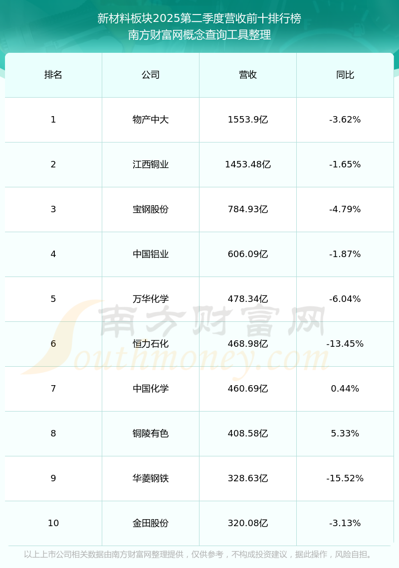 按照南方財富網(wǎng)概念查詢工具統(tǒng)計,該股所屬板塊為新材料板塊,該板塊共有560只股票,五礦發(fā)展2025第二季度營收在該板塊中排名為第27名,該板塊2025第二季度營收排名前十的股票如下表: