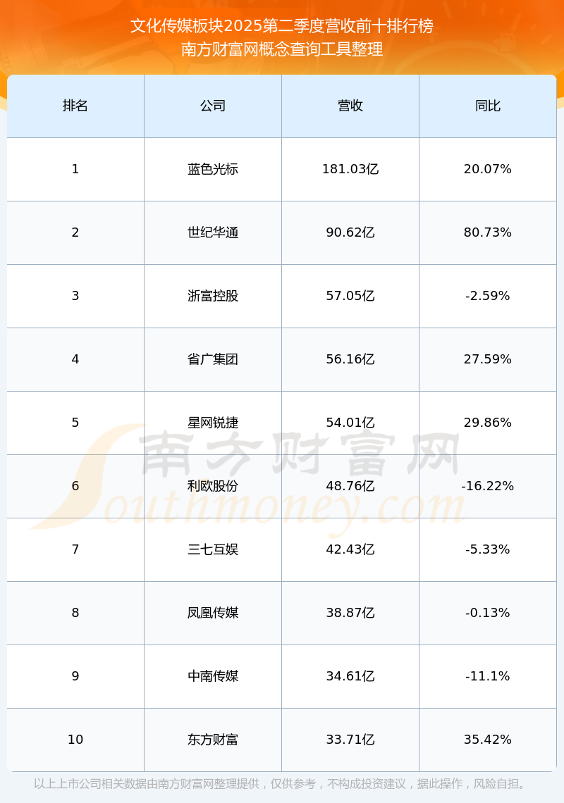 按照南方財富網概念查詢工具統(tǒng)計,該股所屬板塊為文化傳媒板塊,該板塊共有240只股票,歌華有線2025第二季度營收在該板塊中排名為第97名,該板塊2025第二季度營收排名前十的股票如下表: